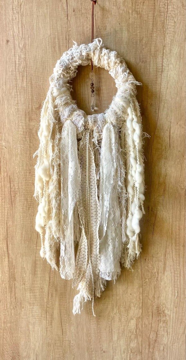 Aro de mimbre con un mix de telas telas, estopa, encage, puntillas y perlas.