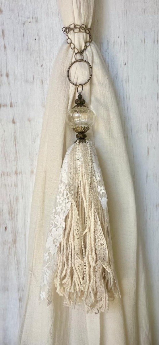 Borla con aplique de cairel, media calota y mix de telas, puntillas y encaje.