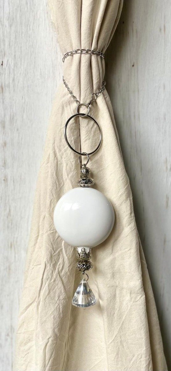 Borla con aplique de cairel, media calota y mix de telas, puntillas y encaje.