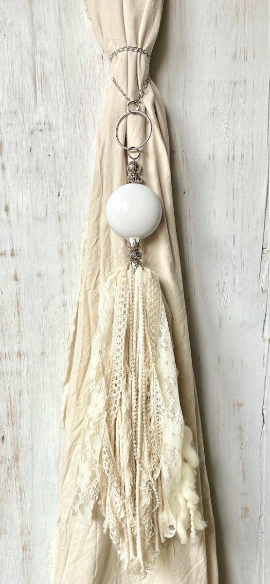 Borla con aplique de cairel, media calota y mix de telas, puntillas y encaje.