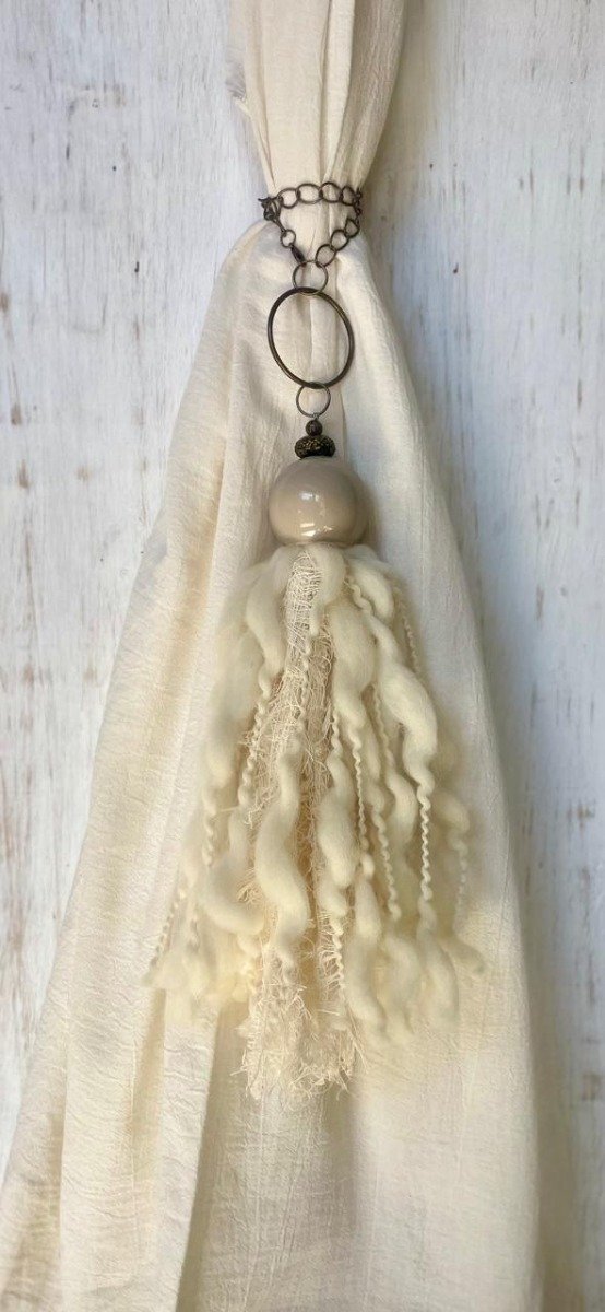 Borla con aplique de cairel, media calota y mix de telas, puntillas y encaje.