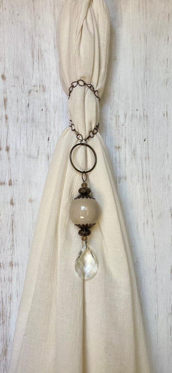 Borla con aplique de cairel, media calota y mix de telas, puntillas y encaje.