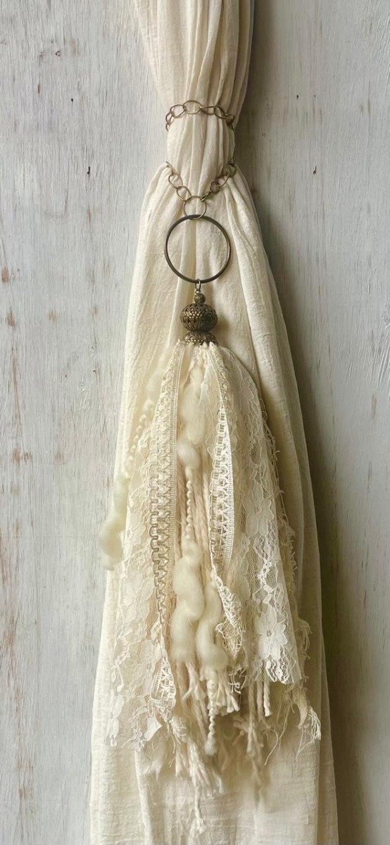 Sujeta cortinas compuesto por aro, calota y mix de telas. Ademas cuenta con cadena y un gancho con cierra facil.