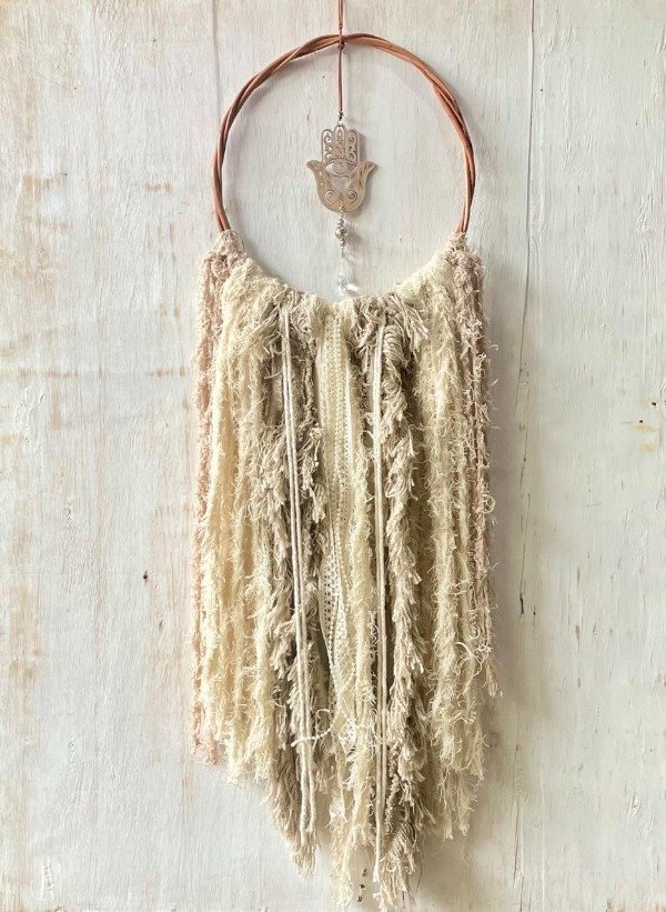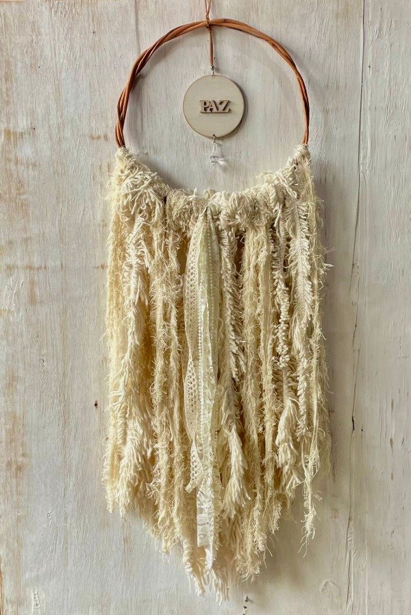 Aro de mimbre con circular de mdf pintado en blanco desgastado y cairel colgante, ademas cuenta un mix de telas telas, estopa, encage, puntillas y perlas.