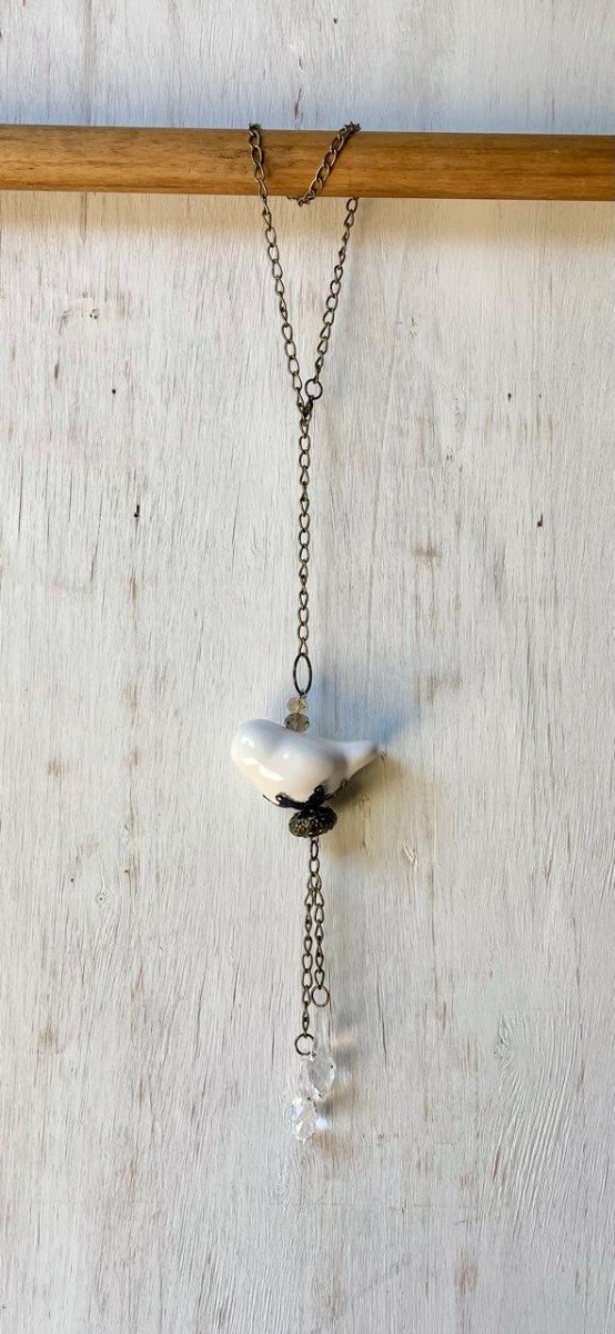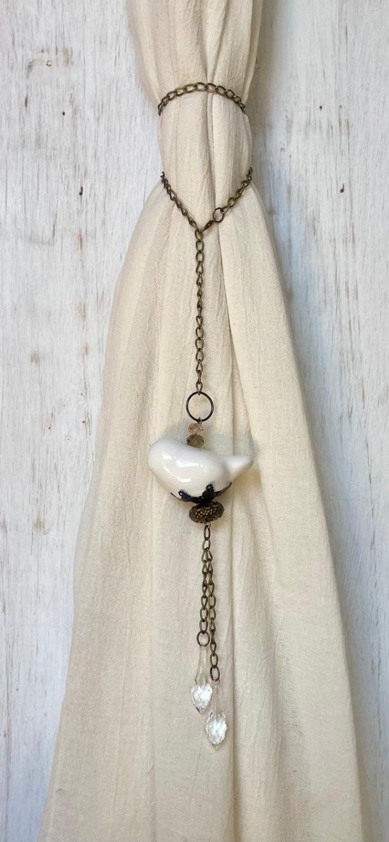 Borla con pajaro, aro,calota y mix de telas, puntillas y encaje.