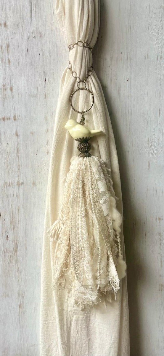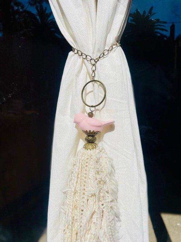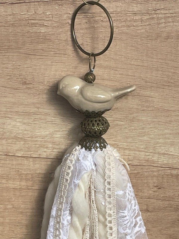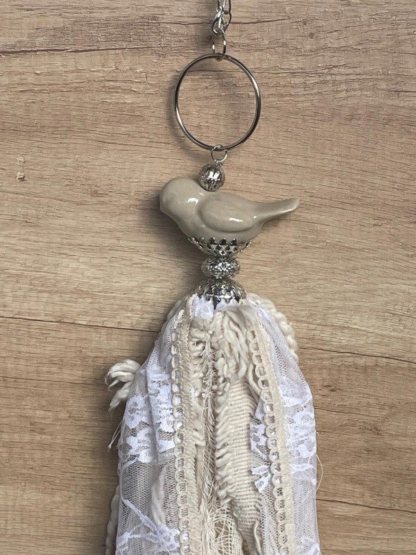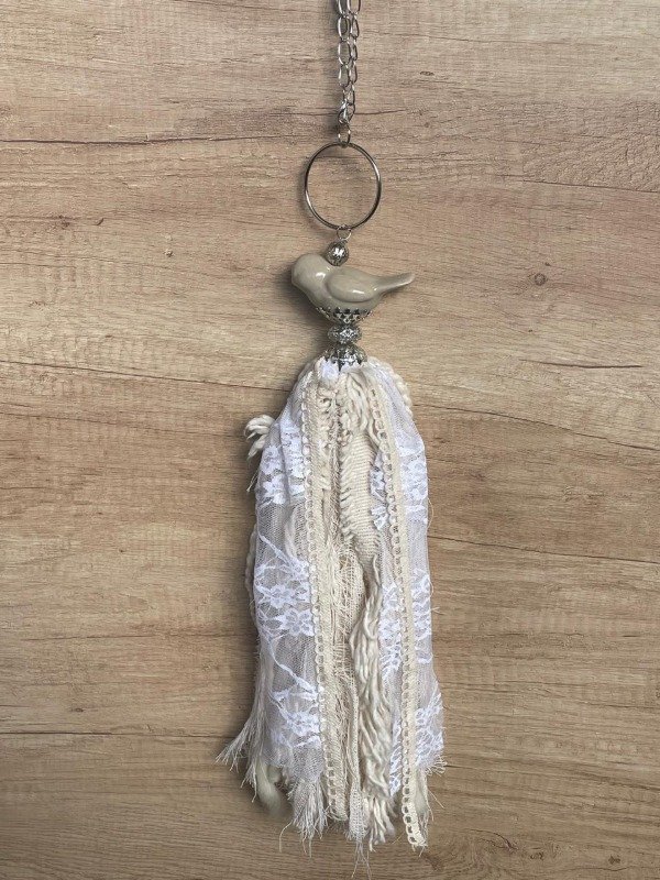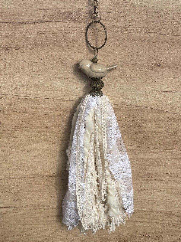 Borla con pajaro, aro,calota y mix de telas, puntillas y encaje.