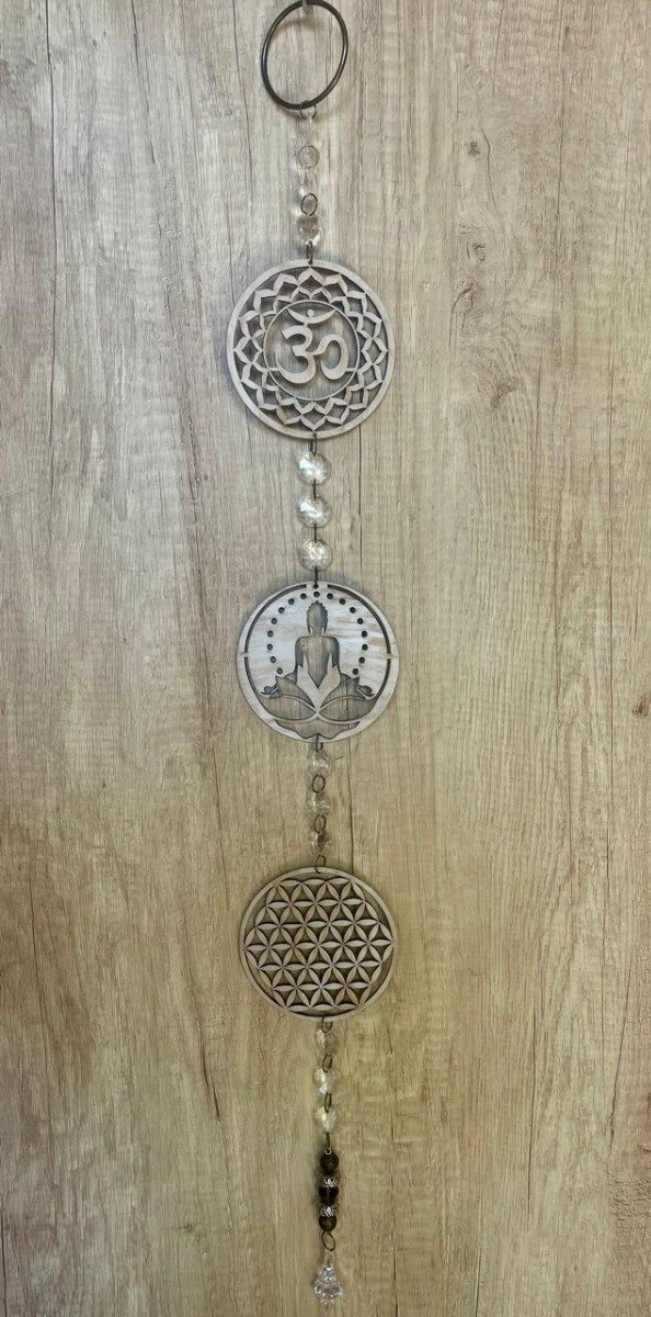 Tiras verticales con diferentes motivos realizados en mdf pintados en blanco desgastado, unidos por diferentes combinaciones de apliques